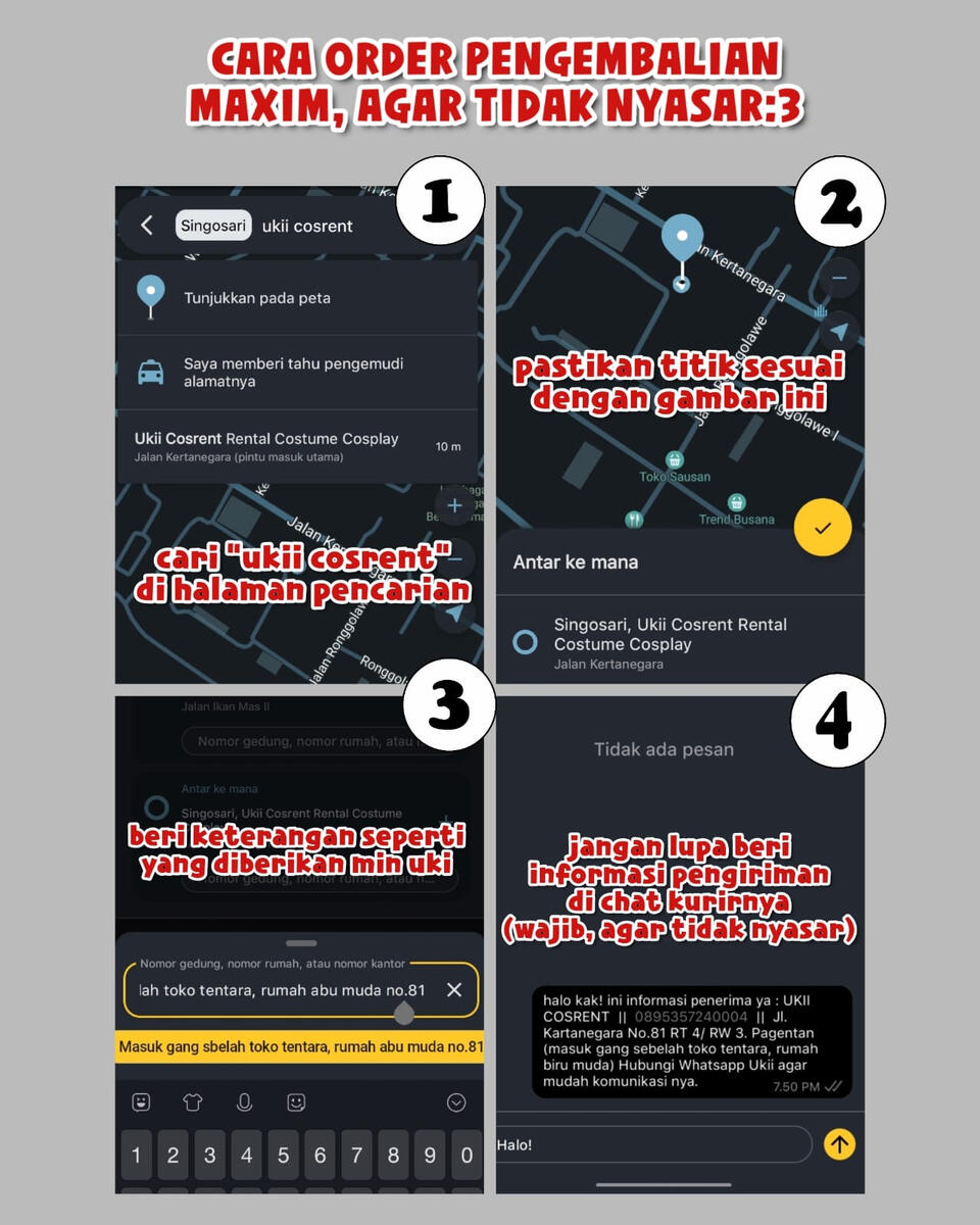 Masuk gang sebelah toko tentara, rumah abu putih no. 81 / Mushola al-hikmah naik tangga.- Chat ke kurir :